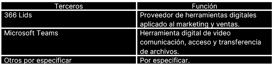 Además, Prommont podría recopilar total o parcialmente sus Datos Personales; así como retratos, mediante sistemas de video vigilancia automáticos con cámaras ubicadas dentro de las instalaciones; o también como resultado de la interacción de usted con las redes sociales Prommont (Facebook, WhatsApp, Instagram, entre otros), Servicios de Sistemas de Automatización de ventas (o CRM Customer Relationship Management) y cualquier sistema de mensajería instantánea por internet.